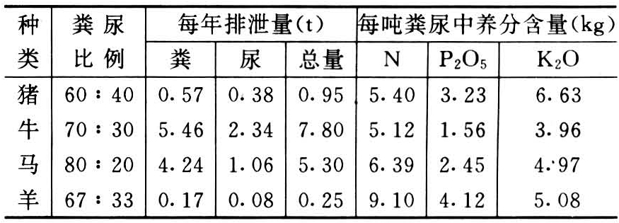 畜粪尿的排泄量因家畜种类、年龄、体重、饲料和使役情况而有不同。一头家畜年积肥量以厩肥计算,牛为10~15吨,猪为5吨,马为10吨,羊为1.5~2吨。不同家畜的年平均排泄量列于表3。准确估计家畜的排泄量和养分含量是б较困难的,1977年德国有人提出一种按畜禽数量估算养分含量的动物肥料单位,即一个动物肥料单位为1头体重500千克的牛(或7头猪或者200只鸡)每年排泄的养分量。排泄量以牛最多,马次之,猪又次之,羊排泄量最少。