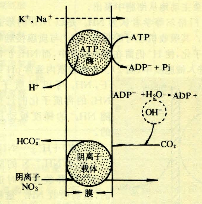 图1 位于膜上的ATP酶活性和HCO3与NO3 -之间的交换关系