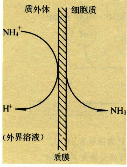 K.门格尔等学者认为NH4 +是以NH3的形态而被吸收。其吸收机理可能是当NH4 +与质膜接触时进行脱质子化,使H+仍留在膜外溶液中,而NH3扩散到膜内,进入细胞质中(图2)。在细胞质内通常pH条件下,NH3可以再质子化,NH3的再质子化的过程是随NH4 +的梯度被动进行的。