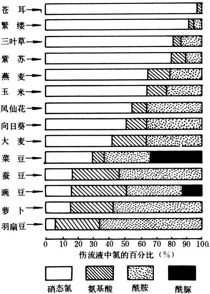 许多温带豆科作物如豌豆、菜豆和羽扇豆中,酰胺尤其是天门冬酰胺和某些氨基酸是木质部汁液的重要含氮溶质。