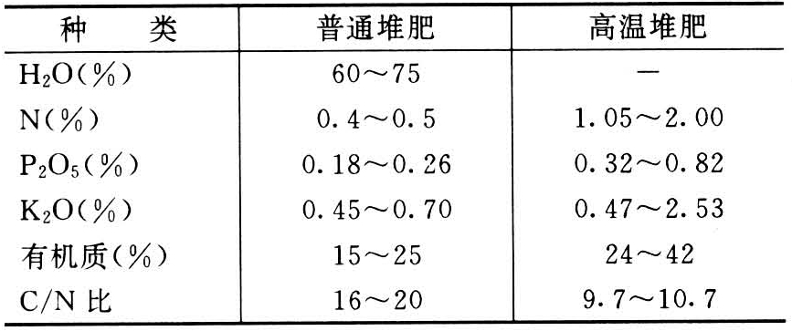 堆肥可分为普通堆肥和高温堆肥两种。普通堆肥发酵温度较低,且腐熟过程中成分变化不大,所需堆制时间较长。高温堆肥是以含纤维多的原料为主,加入适量的马、骡粪和人粪尿,发酵的温度较高。有显著的高温阶段(50~70℃),堆腐的时间较短,对促进堆肥物质的腐熟及杀灭病菌、虫卵和杂草种子均有一定的作用。