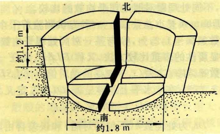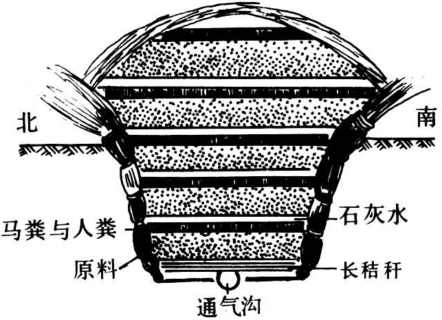 也叫速成堆肥。具有通气好的特点。堆制的特点是接种高温纤维分解菌,并设有通气装置或通气塔,在高温条件下发酵分解。高温堆肥的堆制方式有两种:①地面式。先在地面先铺15~20厘米厚已切碎(5厘米左右)的秸秆,再用玉米秆或高粱秆摆成井字形通气沟,各交叉点竖立小捆玉米秆后,再分层放入配料好的堆肥材料,堆后封泥,拔掉竖立的通气秆,即成通气孔;②半坑式。优点是保温、保水、保肥。坑为圆形(也有长方形),如图1所示。沟内放置秸秆柱,以利通气。坑底上以长秸秆纵横各铺上一层,厚约3厘米。掩盖底部的十字形沟,以免阻碍通气。再铺上已切碎的(长9~15厘米)堆肥材料,厚约60厘米,然后泼洒稀马粪、人尿粪混合液(马粪、人粪尿各100千克,加水250千克)和4%石灰水各一层。如此重复堆积,至原料铺完为止。堆肥材料的铺法是下层厚、上层薄;泼洒粪水混合液及石灰水的量是下层少、上层多。堆完整理堆的顶部,使其为丘形(图2),高出地面约30厘米。上部浇以污水,并用秸秆遮盖。