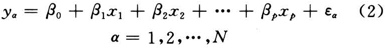 共N个处理的试验,每个处理有户个因素x1,x2,…,xp,取得N个观察值yα。如各因素x与观察值y的内在联系呈线性关系,观察值y可用多元线性数据结构式表示: