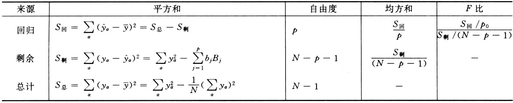 求出式(5)后尚需用方差分析法进行统计检验,将总平方和与总自由度分解为相应的回归与剩余两部分,然后进行F测验并假设各项回归系数等于零,即取无效假设H 0:β1=0,β2=0,…,βp=0。于是作F测验如表1所示:
