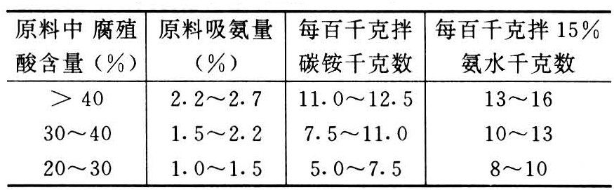 简称腐铵。凡原料中腐殖酸含量在40%以上,而钙、镁等物质含量在2.5%以下的,可采取直接氨化法;当原料中钙、镁含量>2.5%,腐殖酸含量在30%以上者,则采用碳化氨水或碳酸氢铵与腐殖酸钙、镁复分解反应法,或者采用氨化法制取腐铵。具体方法,是先将泥炭等原料晒干或烘干,粉碎过筛(细度40~60目),加入适量氨水(或碳化氨水)和水分,搅拌均匀后,压紧成堆(或在氨化池、罐等密闭容器中)进行氨化反应,一般隔5~7天后出料使用。加氨的数量应根据原料中的腐殖酸含量、吸氨量、酸碱度、细度及含水量而定等,原料中如腐殖酸含量高,吸氨量大,加氨量就越多。若加氨量过少,会影响腐铵的合成。加氨量太多,不仅氨挥发损失,而且产品物理性状也不好。具体配б参考下表。加水量一般为原料最大持水量的40%~50%,使氨化后的物料湿润,手捏成团、落地则散即可。