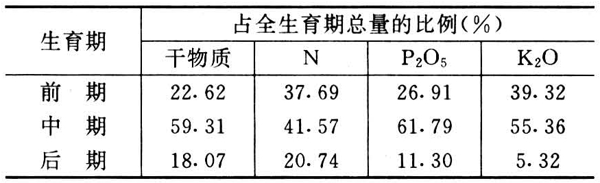 甘薯所需的养分是在不同生育期内吸收的,对氮、磷、钾的吸收有明显的阶段性(见表1),这种吸肥特性与甘薯不同生育期的生长中心以及氮、磷、钾各自对甘薯生育所起的营养作用有密切关系。