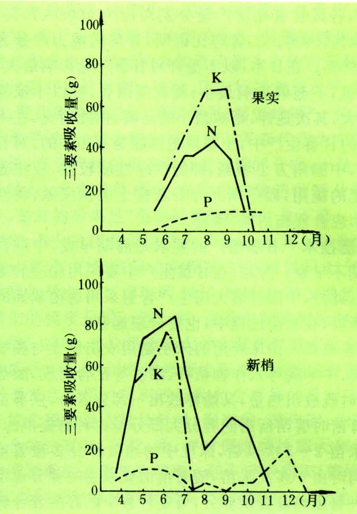 每生产1000千克柑橘,果实平均吸收氮(N)1.75千克、磷(P2O5)0.53千克、钾(K2O)2.4千克、钙(CaO)0.8千克、镁(MgO)0.27千克,N、P2O5、K 2Oб例为1∶0.3∶1.4。根系吸收养分除供果实外,还有大量积累在树体中,其数量约为果实吸收总量的40%~70%。柑橘对氮、磷、钾的吸收,随物候期不同而变化。新梢对三要素的吸收,由春季开始迅速增长,夏季达高峰,入秋后开始下降,入冬后氮、磷的吸收基本停止,接着钾的吸收也停止。果实对磷的吸收,从仲夏逐渐增加,至夏末达高峰,以后趋于平稳;氮、钾的吸收从仲夏开始增加,秋季出现最高峰(图1)。