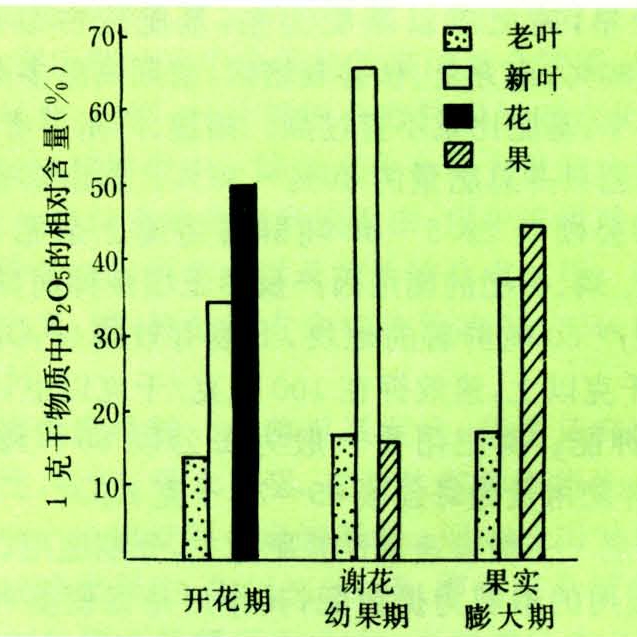 树体内的磷,以花、种子及新梢、新根的生长点等器官含量高,而枝干部分含量低。在不同生育期,因其生长中心不同,器官中的含磷量也有变化。开花期以花中含磷量最高,谢花、幼果期以新抽生的嫩叶最多,果实形成并开始膨大以后,则以果实和新叶为多(图2)。满足磷的供应,可促进花芽分化,提高产量,使果汁、糖分增加,酸度降低,品质改善。