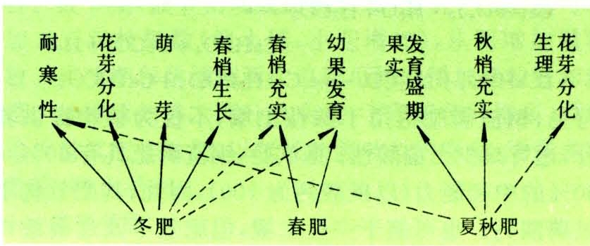 根据柑橘不同生长期对养分的需要,柑橘施肥一般分为3次:①春季发芽肥。主要是促进春梢充实,形成结果枝,并供给开花结果的养分,为当年抽梢结果和翌年健壮的结果母枝打下良好基础。发芽肥按萌芽时期的早晚而定,一般在春芽萌发前1~2星期或春梢转绿时施。施用过早,气温低,根系吸肥力弱,肥料利用率低;施用过迟,在抽梢、开花时肥效不能及时发挥。发芽肥以氮肥为主。②夏秋保果、壮果肥。这次肥料又可分为夏季保果肥和秋季壮果肥。夏季柑橘幼果正处在细胞旺盛分裂时期,需要大量养分,如果营养不足,常发生大量生理落果。因此,应在第一次落果后,第二次生理落果前,即5月下旬追施一次以速效氮肥为主、配以磷肥的保果肥。秋季除果实迅速膨大外,树体还要抽出大量秋梢,作为翌年的结果母枝,因此形成一个突出的吸肥高峰。这次肥料常在柑橘停止落果后施用,以化学氮肥为主,配施一些磷、钾肥,以提高果实品质,又能使夏秋梢充实,并为花芽生理分化奠定物质基础。③冬施采果肥。橘树经过开花结果,树体消耗了大量养分,为了恢复树势,促进花芽分化,充实结果母枝,保证第二年抽梢结果所需养分及提高树体抗寒能力,采果前后必须施肥。通常早熟品种应随采随施,晚熟品种应先施后采,但不宜早于采果前一星期,晚于采果后一星期。过早施用常使果实延迟成熟,过晚施用肥效不易发挥,不利于树势恢复和翌年花芽分化。采果肥以厩肥、饼肥等有机肥为主,并配施一定б例的速效性化学肥料。三次施肥对柑橘周年生长的作用见图3。