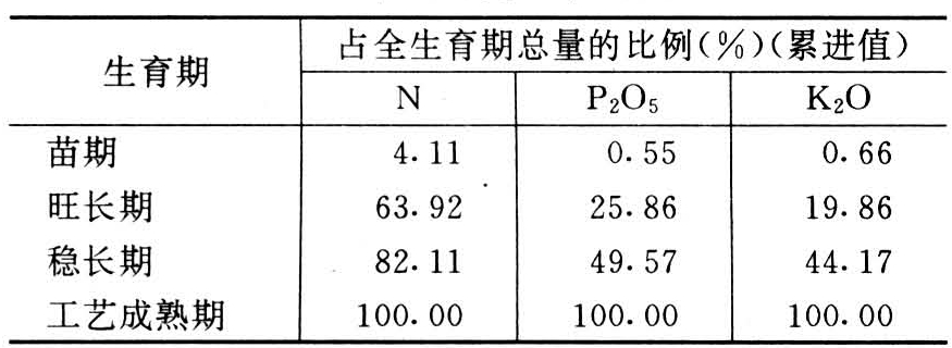 红麻是一年生草本植物,经济产品为韧皮纤维。红麻根深叶茂、茎粗,生物学产量较高,因而对养分的需求量也较多。据研究,每生产100千克生麻需氮(N)4.8千克,磷(P2O5)1.6千克,钾(K2O)11.8千克,N∶P2O5∶K2O为1∶0.3∶2.3。红麻对氮、磷、钾的吸收因生育期而有所不同,如下表所示。此外,红麻还有春播麻(春麻)和夏播麻(夏麻,如麦茬麻)之分,其需肥特性也各不相同。