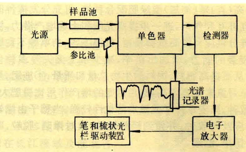 为红外分光光度计。它的作用是测定被物质吸收后透过的各个波长的红外光的透过率,并给出该物质的红外吸收光谱。仪器由下列部分组成:①能产生连续红外光的辐射源;②使红外辐射色散的单色器;③测定红外辐射强度的高灵敏检测器和电子放大装置;④记录仪。双光束红外分光光度计的示意图如下图所示。