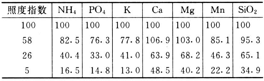 光对养分吸收的影响,在于通过光合作用供给根以糖类等能源。光照充足,光合强度增加,供给根部的呼吸底物多。而养分吸收与呼吸作用供应能量有关,当能量供应充足时,养分吸收也多。1954年日本高桥治助等把水稻幼苗置于不同光照强度下,研究不同光照度对水稻吸收各种养分的影响。结果发现在光照不足情况下,各种养分的吸收均减少(表),尤以NH4、PO4、K与Mn吸收量减少最明显,而Ca和Mg的吸收影响较小。其吸收降低的顺序是:P2O5>K2O>NH4,MnO>SiO2,MgO>CaO。
