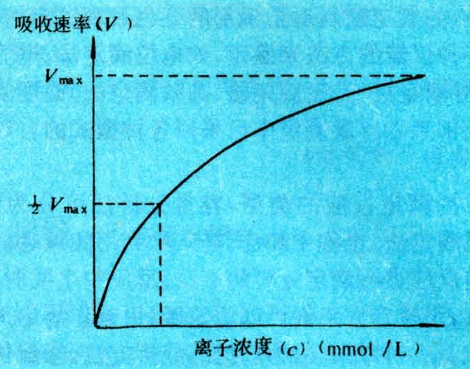 上述公式表明,随着根表面溶液中离子浓度(C)的逐渐提高,植物对养分的吸收速率,也相应增加,到吸收速率为最大时,再进一步提高养料浓度,对吸收速率就不会有任何增加。