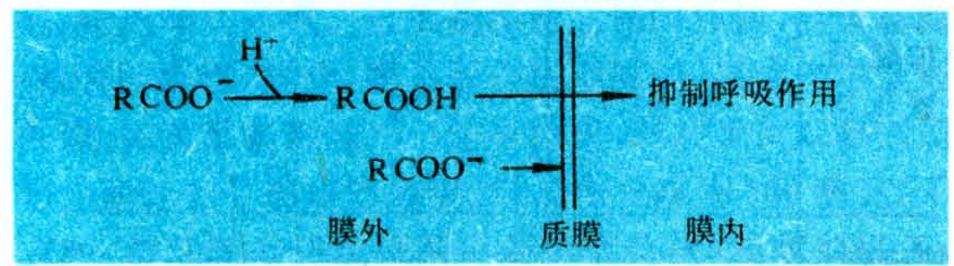 有机酸中某些脂肪酸以质子化的形式(RCOOH)渗透到细胞内,影响呼吸作用;而解离的脂肪酸(RCOO-)不能进入细胞,如下所示: