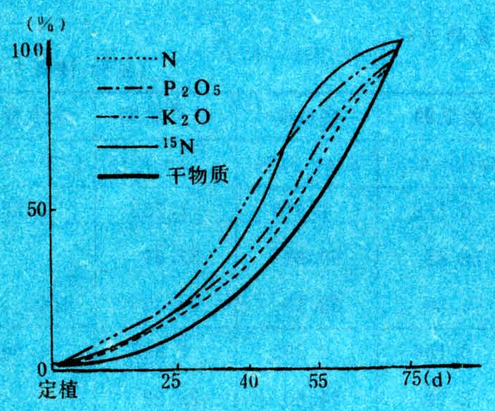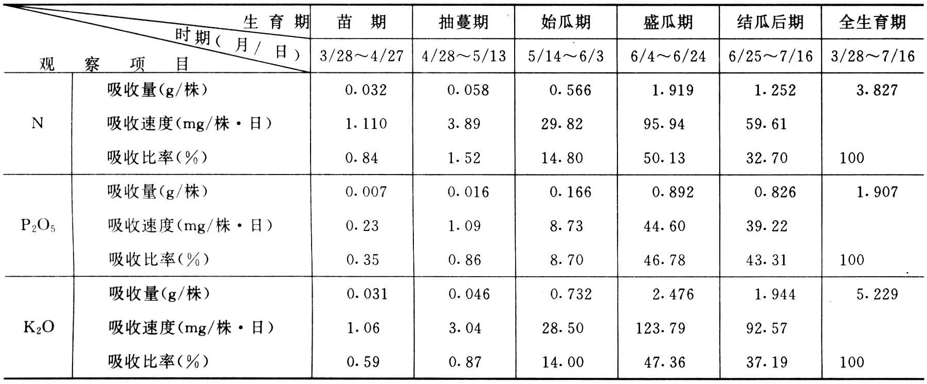 黄瓜植株各器官中干物质和氮(N)、磷(P)、钾(K)三要素的含量б值,随黄瓜的不同生育期而变化。从播种到抽蔓期末,营养物质的分配以根、叶为主,还有部分物质用于抽蔓和花芽的分化与发育,氮、磷、钾的含量分别占总吸收量的2.4%、1.2%和1.5%。在进入结瓜期,植株的生长量显著加快,植株的干物质和三要素的积累速度迅速增加,结瓜盛期时达最大值,在此期的20多天内,吸氮量占总氮量的50%,吸磷量占47%,吸钾量占48%左右。到结瓜后期,植株生长缓慢,干物质和三要素积累速率渐少(表1)。一般平均单株的吸氮量为4~6克,P2O5为1~1.9克,K2O为6~9克,CaO为3~4克,MgO为1~1.2克。