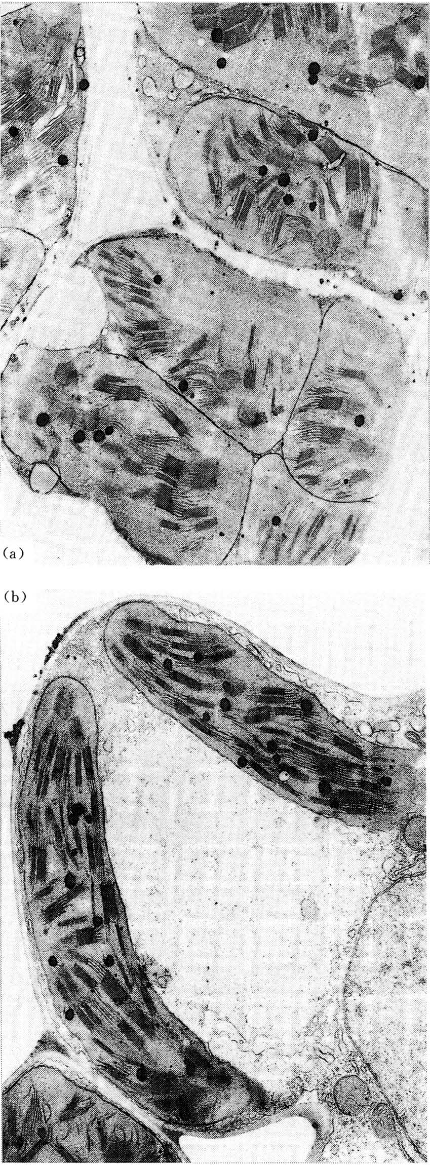叶绿体是光合作用的重要细胞器,适量施钾的植物叶绿体内有较多基粒;缺钾时叶绿体的基粒较少,使光合作用受到影响;图1为盆栽杂交稻威优35号,在分蘖期不施钾及适量施钾处理的叶绿体超微结构的电镜照片(放大12000倍)。从图中可见钾缺乏使叶绿体失去正常结构,其形状较短而圆,基粒明显较少;适当施钾处理的叶绿体呈扁圆形,基粒较多。观察番茄不同钾水平处理叶的叶绿体情况亦相似。