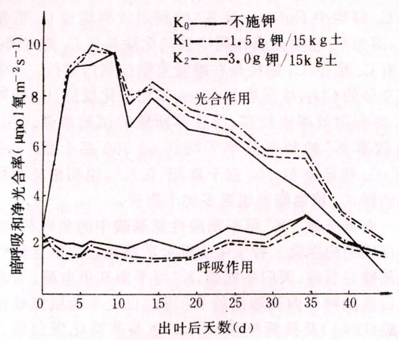 缺钾还使叶绿体发育迟缓而解体较早,图2示水稻缺钾处理(盆栽,不施钾)及适量施钾处理的叶绿体发育情况,从图2中可见,出叶后第2天缺钾叶的质体中尚有原片层体,而适量施钾的质体内则原片层体已发育成片层体。出叶25天后,缺钾叶绿体已开始解体,片层结构趋于模糊,当时叶片的净光合率明显下降,而施钾处理的叶绿体仍具有较完整的超微结构,叶片的净光合率明显高于不施钾处理。不同钾水平处理植株叶片发育过程中,其叶绿体的发育情况与叶片净光合率的动态变化进程相吻合,如图3所示。缺钾使叶片发育过程中净光合率降低而暗呼吸速率增高,故光合产物形成量减少而消耗量增多,易引起早衰。