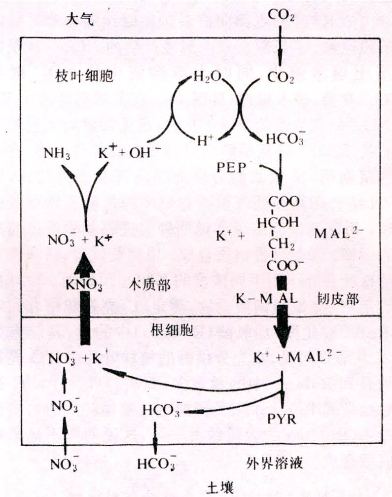 钾促进植物根对NO3 -的吸收,并促进NO3 -在植物体内的运输,K+是NO3 -和苹果酸阴离子在植物体内运输过程中的反离子(counter ion),如图4所示。根吸收的NO3 -从根运往地上部的过程中,K+可平衡其电荷;另一方面,地上部磷酸烯醇丙酮酸固定CO2形成草酰乙酸,后者还原形成苹果酸。苹果酸阴离子经韧皮部运往根系的过程中,K+也有平衡电荷的作用。在根内苹果酸脱羧产生的HCO3 -释放到土壤溶液中时,NO3 -则吸入根内,根内的K+又可在NO3 -经木质部运入地上部过程中平衡其电荷,可见K+可促进NO3 -的吸收和运转。