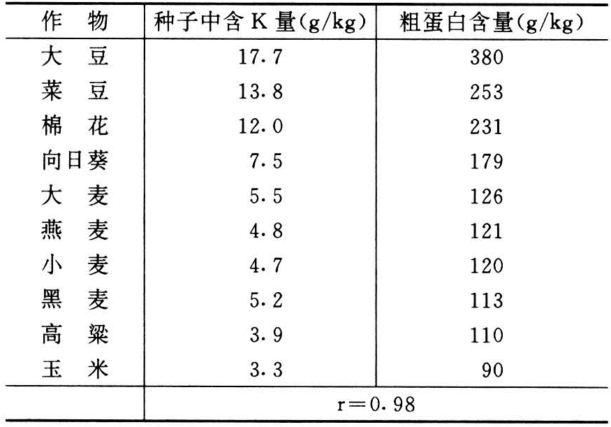 蛋白质含量较高的作物,其茎叶内亦含有较多的钾。收获种子的作物其种子中蛋白质含量较高的,钾含量也较高,二者间呈正相关(表2)。种子中的蛋白质体亦含有大量的钾。在植物体内蛋白质大量合成的分生组织,其含钾量亦较高。在体外试验中,维持蛋白质合成的最高速度需要K浓度为每升100~150毫摩尔,若K浓度低于此值,则蛋白质合成速度下降。