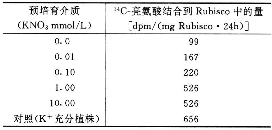 钾在植物蛋白质代谢中的功能为:①促进根对NO3 -的吸收与运转。在根吸收NO3 -与NO3 -向地上部运转的同时,K+与NO3 -一同经木质部向枝叶运输;枝叶内的K+经韧皮部向根系运输时伴随着苹果酸阴离子的运输。苹果酸在根内脱羧产生的HCO3 -从根释放至土壤溶液中,同时土壤溶液中的NO3 -则与HCO3 -交换,进入根内(见图4)。在木质部汁液中K+与NO3 -的б值常为1∶1左右,足见二者间上述相伴随的关系。②促进氨基酸向蛋白质合成部位运输。在小麦灌浆期用15N-氨基酸分别处理高钾及低钾植株,发现15N结合到高钾处理植株谷粒中的量明显高于低钾处理;用蓖麻试验结果亦说明钾促进氨基酸通过韧皮部的运输。③促进蛋白质合成。用苜蓿试验,将缺钾苜蓿植株叶在光下用不同浓度的KNO3预处理20小时。然后用14C-亮氨酸饲喂动物,测定14C-亮氨酸结合到叶内RuBP羧化酶/加氧酶(Rubisco)中的量,其结果如表3。从表3可见,在充分供钾的植株叶片中,14C-亮氨酸结合到Rubisco中的量最多,而缺钾叶片中,14C-亮氨酸结合到R ubisco则受到抑制。植物叶片的可溶性蛋白中,Rubisco的含量约占一半,这说明钾不足影响蛋白质合成。