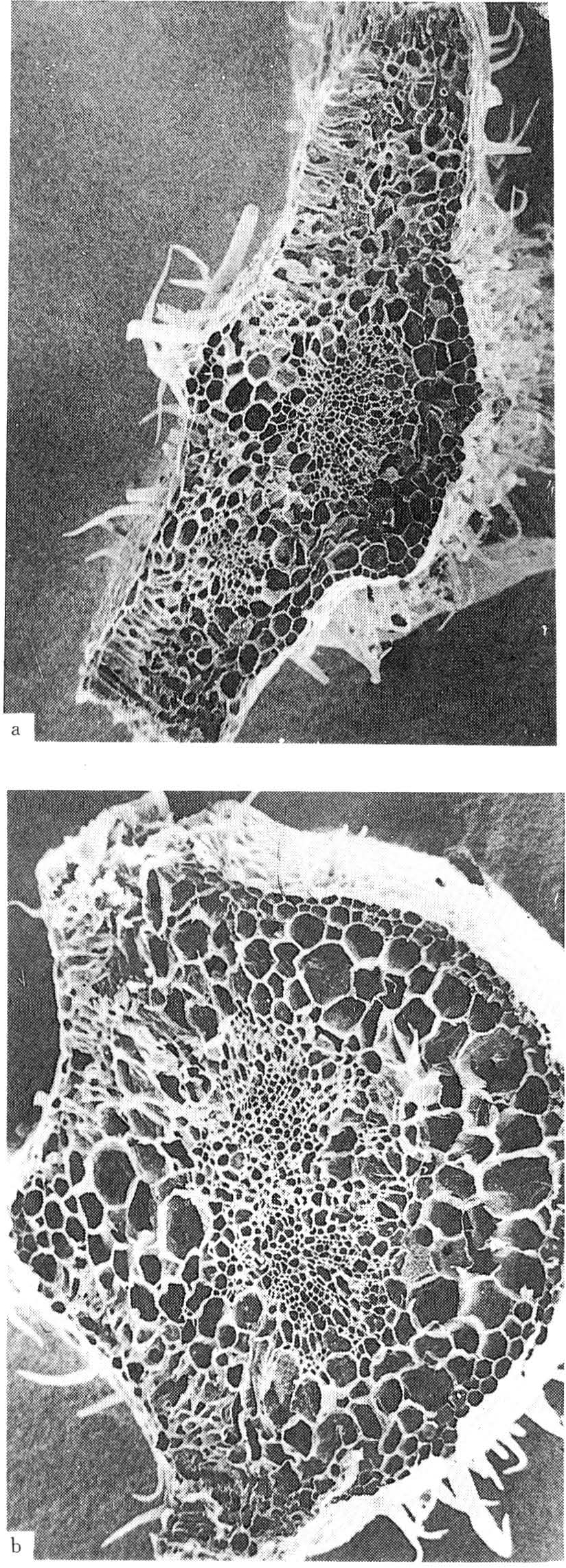 植物缺钾时膨压降低,在水分胁迫下易萎蔫,植物组织及细胞器常发育不正常,木质部及韧皮部形成较皮层组织受到更大的抑制,木质化受阻,维管束厚壁组织及角质层均不发达(图5)。禾谷类作物缺钾时硅化程度低,如图6所示,故叶片较软弱易披叶,植株易倒伏。