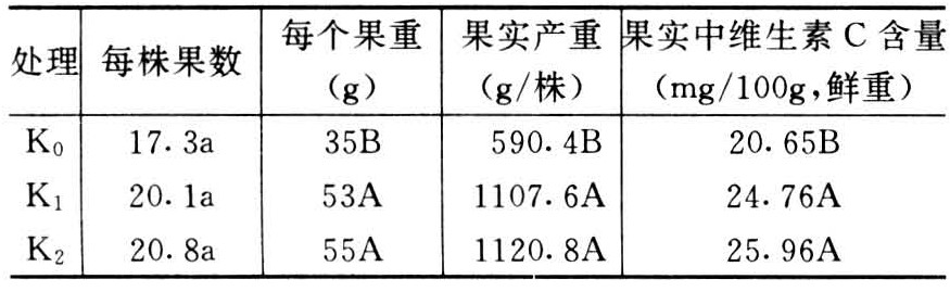 缺钾细胞膨压降低,细胞小,叶面积减小,整个植株的光合面积减小,影响产量形成。图7示植物在不同钾水平处理下的生长情况。缺钾的番茄果实中有较多脱落酸(ABA),易脱落,成熟果实中多各种病态果实。一般果实也较小,色较黄而不红,维生素C含量较少(表4),所以缺钾时,其产量和品质均降低。