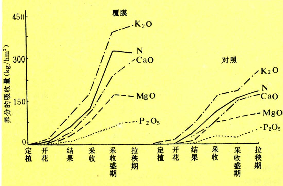 图1 地膜覆盖甜椒不同生育期养分吸收量(蔡绍珍等,1990)