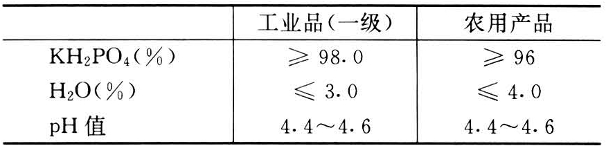 工业上生产磷酸二氢钾,大都由磷酸与氢氧化钾或碳酸钾按比例中和制成。如用硫酸钾作钾源时,须先将硫酸钾转化成氢氧化钾,再用磷酸中和,两步反应为:K2SO4+CaO+H2O→2KOH+CaSO4↓,KOH+H3PO4→KH2PO4+H2O。利用草木灰(含K2CO3)制造磷酸二氢钾时,可先将草木灰淋水,收集其中滤液熬煮浓缩,然后与磷酸反应,可得到磷酸二氢钾粗制品。中国磷酸二氢钾产品质量的国家标准为: