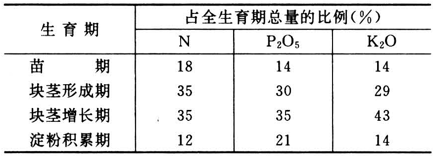 从出苗至孕蕾期间,生长中心是茎和叶,兼有地下根系的纵深扩展和匍匐茎的水平方向伸展。马铃薯的块茎是一短缩而肥大的变态茎,由匍匐茎顶端膨大而成,所以,苗期匍匐茎的生长对结薯数有直接影响。苗期是马铃薯的营养生长期,一直到主茎生长点开始孕蕾、侧枝开始发生、匍匐茎顶端停止极性生长并开始膨大时,约持续23天。苗期所需的养分大部分是由种薯供应的,在种薯萌发长出根系后,植株便从土壤中吸收一定数量的养分。马铃薯苗期植株所吸收的氮、磷、钾分别为全生育期吸收总量的18%、14%和14%(表1)。苗期是以氮素代谢为主的时期,茎、叶中的淀粉及还原糖的含量都б较低,光合产物主要用于茎叶的生长。苗期养分的积累量大于干物质积累量,植株中氮、磷、钾的含量为各生育期的最高量,分别为3.8%、0.5%和4.5%,这样不但能保证苗期茎叶的生长,而且使更多的匍匐茎形成,为块茎的形成提供良好的物质条件。马铃薯对磷反应较为敏感,当营养环境严重缺磷而氮相对过剩时,硝酸根()对磷酸根(