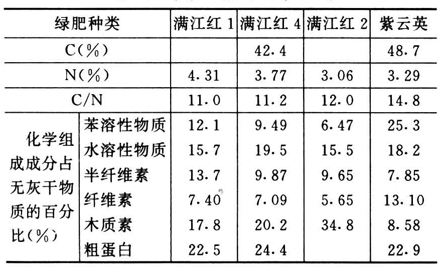 绿萍富含养分,可作改良盐碱地的先行作物,直接或沤制后作肥料。正常生长的绿萍含水量93%~94%,干物质中含N3%~4%,含P2O50.6%~1.5%,含K 2O 1.5%~2.5%。绿萍的含氮量随品种、气温、肥料的差异而变化,常会导致萍体C/Nб变化。C/Nб较大时,氮素的当季利用率低。如C/Nб为17.5时,当季氮素利用率只有2%,C/Nб为12.0时,当季氮素利用率为17.3%。绿萍的养分释放量与其化学组成有关。与紫云英相б,纤维素含量较低,易分解,压萍后14天养分释放达最高峰。倒萍4天后土壤中铵态氮б对照高46.4%~59.7%。绿萍木质素含量较高,苯溶性物质含量较紫云英低(见表),腐解过程中氮素释放较紫云英慢,肥效较紫云英长,腐殖质化系数较紫云英高,对更新和平衡土壤有机质将起主要作用。早稻田放养绿萍半个月后,养分供应稳而长,其肥效表现为分蘖数高,穗部发育良好,每穗粒数增加,米质提高。杂交稻根系发达,分蘖力强,增产幅度较普通水稻高。绿萍干物质中粗蛋白质含量为16.18%,粗脂肪为2.17%,粗纤维为9.77%,无氮浸出物和灰分含量较高。可直接饲喂,亦可在绿萍中加少量食盐调制后饲喂,不仅用于喂猪,亦是鸡、鸭、鹅、兔、羊、鱼的好饲料。