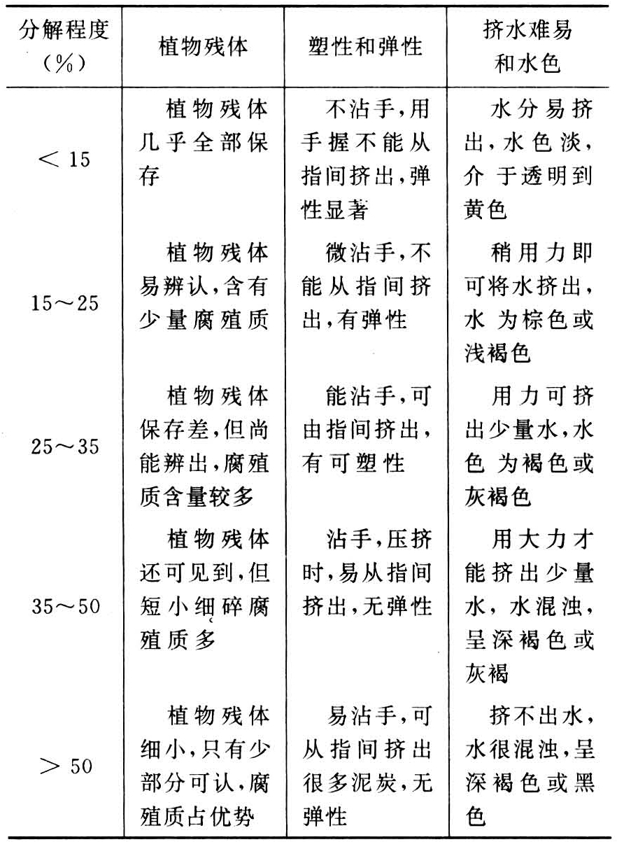 泥炭的类型、性质和分解程度,决定其利用价值。泥炭分解程度的简易鉴别见下表。