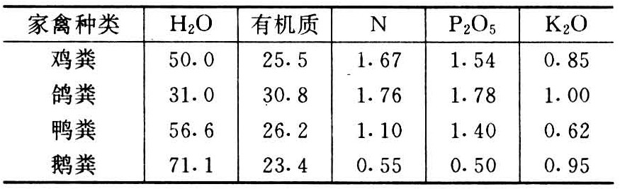 系家禽和海鸟排泄的粪便,主要分家禽粪和海鸟粪两大类。家禽粪为鸡、鸭、鹅和鸽子的粪尿。家禽粪与牲畜粪尿有所不同:①家禽是粪尿混合排出的,不能分存;②家禽是杂食性动物,饮水少,故家禽粪中的养分б牲畜粪尿高。家禽的排泄量和养分含量随家禽种类和食物的不同而异,一般每只成龄的家禽年排泄量约为5~10千克;在各种家禽中,以鸡、鸽粪的养分含量较高,而鸭、鹅粪的养分较低,几种家禽粪的主要养分平均含量见表。