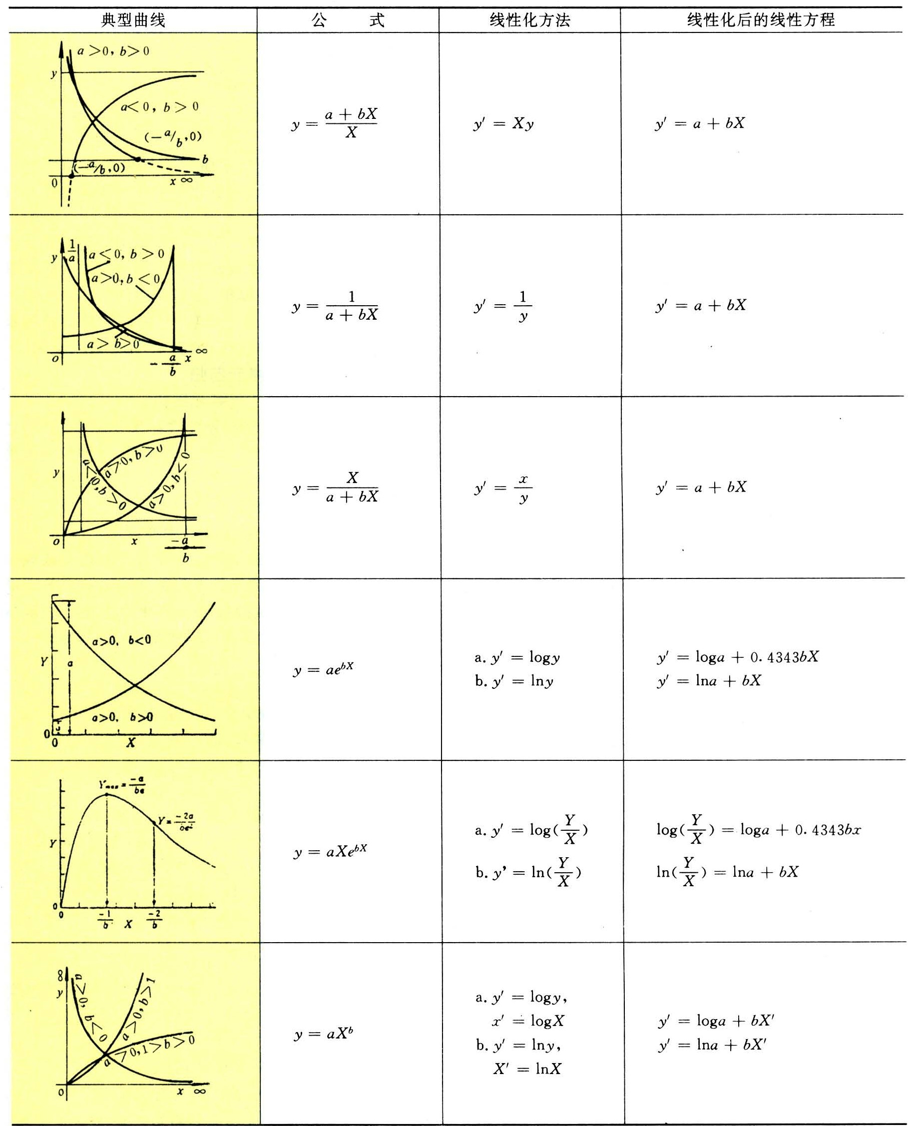 建立不同变量间相关关系的非线性数学模型数量关系式的统计方法,也称为非线性回归。农业化学中各种因素间的相互关系多数是曲线关系。可化为直线的回归是曲线回归中应用最广泛的形式。对某种形式的曲线回归模型取一定形式的变量变换,转换为线性回归模型,即可将曲线回归以线性回归的方法计算出式中各项参数,并进行统计检验和推断。可化为直线的曲线回归种类多样,常用的见表。多项式回归见多元回归。