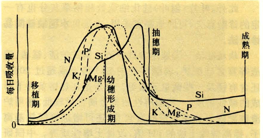 水稻对各种养分的吸收速度均在抽穗前达到最大值,以抽穗为分界线,其后有迅速降低的趋势。在各养分中,以氮、磷、钾的吸收速度最快,即在抽穗前约20天达到最大值,硅的吸收达到最大值最晚(图)。水稻各生育期对养分的吸收,因类型不同而有较大差别。双季稻生育期短,特别是大田营养生长期更短,营养生长和生殖生长在移栽后不久就重叠,即在大田出生分蘖的同时开始穗分化,又在穗分化过程中进入分蘖盛期,因而在移栽后2~3个星期形成一个突出的吸肥高峰;单季稻则在移栽后2~3个星期及7~9个星期形成两个吸肥高峰。