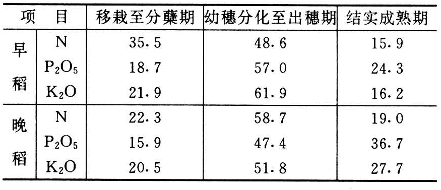 从移栽到分蘖终期早稻对氮、磷、钾吸收率高于晚稻;从出穗至结实成熟期,晚稻又高于早稻。但幼穗分化至抽穗期,不论是早稻还是晚稻,吸收养分数量均占吸收总量的一半以上(表1)。杂交水稻(品种为南优2号)在分蘖至孕穗这一阶段是三要素吸收量的高峰期。约占吸收总量的80%,对氮、磷、钾的吸收则以幼穗形成期为最多。这个吸肥特点与常规品种类同,不同的是从齐穗至成熟期对三要素吸收较多,约占20%。这可使植株在生育后期维持较高的营养水平,确保叶片进行光合作用,使迟开的弱势花得到充足营养,提高结实率和千粒重。