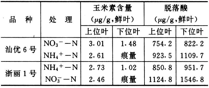 表2 不同氮源对水稻叶片玉米素及脱落酸含量的影响*