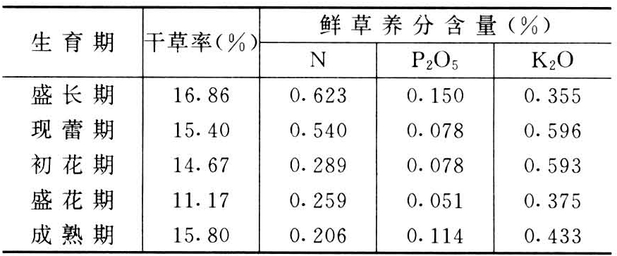 苕子不同生育期产草量和养分含量不同,以茎叶盛长期和现蕾期植株体内养分含量最高(表),初花盛花期产草量、总养分含量最高。各器官中的养分含量,以干物质计算,叶和种子中氮的含量,最高分别为3.12%和5.08%,花和种子中磷的含量较高,为1.32%~1.34%,茎与花中钾的含量最高,达3.31%~5.58%。苕子茎叶中富含纤维素、粗蛋白质。其含量随品种和收割期而异。盛花期的粗脂肪和粗纤维含量高于蕾花期。