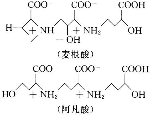 作物种类不同,其缺铁反应机理以及对土壤中铁的吸收利用能力各异。一般双子叶植物对缺铁反应敏感,而单子叶作物在缺铁时根系能诱发分泌一类螯合铁能力极强的物质,称为植物摄铁素(phy-tosiderophore)。如阿凡酸(avenic acid)或麦根酸(mug-ineic acid),其化学结构式如下: