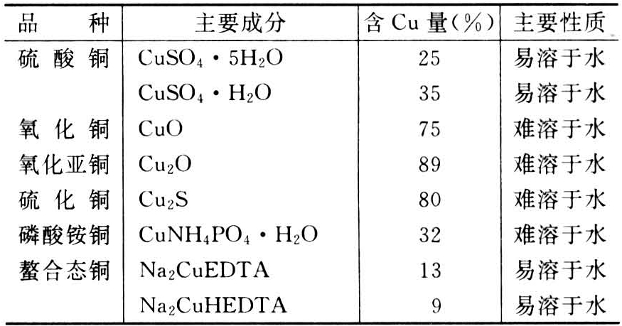 常见的铜肥品种列于下表。中国常用的铜肥品种是硫酸铜。此外,含铜矿物、含铜工业废渣、选矿尾渣、含铜过磷酸钙、含铜玻璃肥料均有不等量的铜元素,可适当作为铜肥施用。中国农村多数利用硫酸铜与石灰配制成波尔多液,兼作铜肥施用。