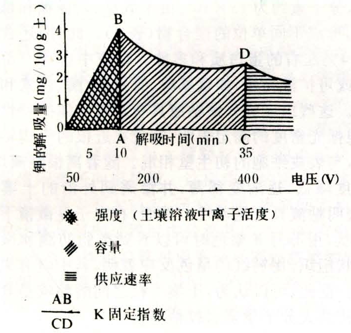 -和带负电荷的粘粒等)向阳极移动。由于溶解和吸附的离子之间不能达到平衡,故而原被吸附的离子不断地释放到溶液中。而阳离子的解吸速率和磷酸盐、碳酸盐等的溶解速率与所加的电压成正比,与土壤对离子的结合能成反比。只要选用不同的电压和时间,即可将结合能力不同的各级离子区分开,并根据各自的电超滤曲线了解解吸过程或溶解过程的动态,以测定养分供应的强度、容量和速率。