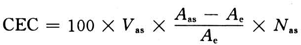 用放射性同位素测定阳离子代换量是将土壤首先用乙醇洗,除去可溶性盐后与砂混合,转移到一个渗析管中,然后用乙酸锶溶液渗滤至饱和状态,除去过剩的盐,干燥。将一份已知浓度的85Sr-乙酸锶溶液加到已知量经上述处理后的土壤中,达到平衡状态时,即溶液中放射性锶的浓度不变时,测定土壤悬液中放射性活度,由放射性活度的减少,计算阳离子交换能力(CEC):