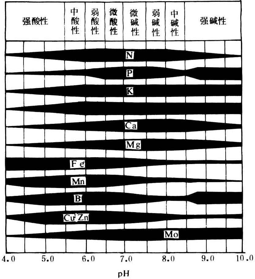 包括土壤酸度、土壤氧化还原性质以及土壤固相的化学性质等。它们主要是影响养分的化学形态和它们的溶解度。图表明,土壤pH值对养分有效性具有明显的影响(用带的宽度定性地表示养分有效性的高低。