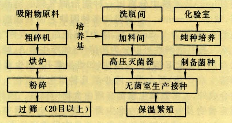 将种菌移到液体培养基中,经保温培养,待繁育旺盛后,分别拌以泥炭或园土、河塘泥等吸附剂。吸附剂和培养基的制作见图1,再经培养繁殖,成为母剂或菌剂。液体培制法又因培养对象不同分为细菌类通气培制法、放线菌类通气培制法和嫌气菌类发酵培制法三种。液体培制法的优点是可进行机械化生产、节省人力物力等,但其操作技术和设备条件要求较严格。该法分培养和加工两个生产工序。一般细菌类菌剂的培养工序包括种菌培养、一级培养、二级培养和大量培养等;放线菌剂可省去其中二级培养。各过程均要求按无菌操作进行,特别是种菌培养和一级、二级培养,无菌要求更为严格。因这些工序培养物的质量,直接影响到此后的大量培养质量。加工工序包括吸附剂晒干、碾碎、过筛、灭菌、加料加菌(剂)、温室培养等。上述两个工序中各培养环节所要求的培养基配方,酸碱度,培养温、湿度也因培养对象不同而异。
