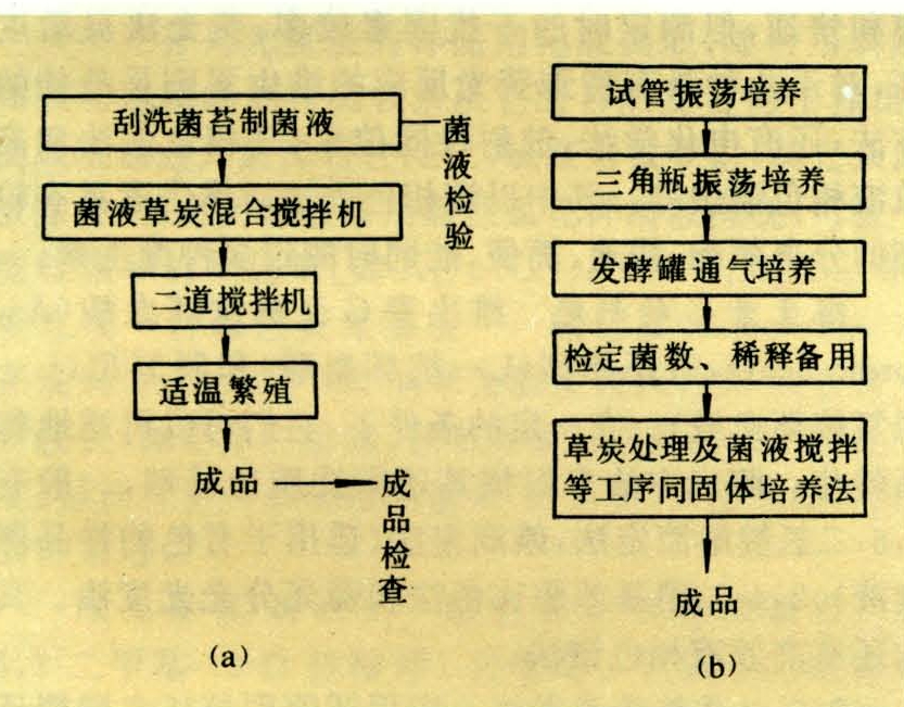 将种菌移到固体培养基的表面,经过保温培养,至培养基表面长出丰满的菌苔后,将其刮洗并拌入吸附剂,再经培养繁殖成母(菌)剂。该法的生产工序除在大量培养基中添加一定量的凝固剂以及培养成功后的刮洗菌苔等操作以外,完全与液体培制法相同。菌肥培制工序示意如图2。