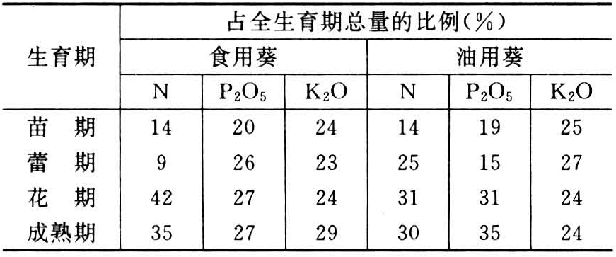 向日葵是高秆作物,对养分的需求量,特别是对钾的需求量较多,属喜钾作物。向日葵又有食用葵和油用葵之分。油用葵的籽实含油率比食用葵高,对氮、磷、钾的需求量也比较多。据辽宁省研究,每生产100千克籽实,食用葵需氮(N)6.22千克,磷(P2O5)1.33千克,钾(K2O)14.6千克,N∶P2O5∶K2O大致为1∶0.2∶2.3;油用葵需N 7.44千克,P2O51.86千克,K2O16.6千克,N∶P2O5∶K2O约为1∶0.3∶2.3。向日葵在不同生育期对氮、磷、钾的吸收见表。