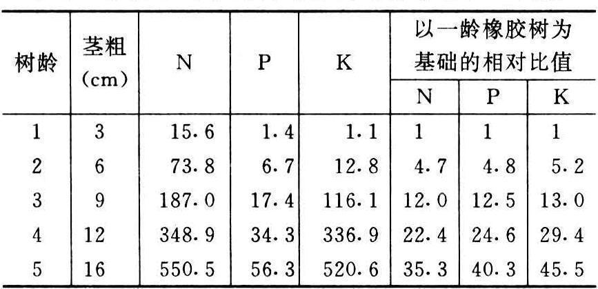 橡胶树是多年生热带作物,从幼苗到成龄开割阶段的幼树期,植株对养分的吸收随树龄增加而急剧增长。其中钾(K)增长最快,氮(N)增长相对较缓(表1)。5龄后树冠基本成形,生长近于稳定,养分吸收亦趋于稳定。氮和磷(P),特别是磷能显著促进橡胶幼树茎的加粗生长,但近成龄时单施磷不但没有好处,还出现负效应。中国植胶的土壤,钾肥对橡胶幼树生长无反应或呈负效应;成龄产胶树,施用氮肥增加产胶量,在每年抽第一和第二蓬叶前施氮肥,可多产胶5%~10%。磷对橡胶合成和乳管的发育有重要作用,正常供磷可保持良好的干胶含量。橡胶树叶片含钾量相当高,缺钾时出现黄叶病,叶早衰,影响产胶量,胶乳的稳定性亦差。镁(Mg)也是胶树需要的重要元素,缺镁时发生鲱骨状黄叶病。成龄橡胶园每公顷每年由土壤中吸收主要营养元素的数量,纯氮112.95千克,磷27.6千克,钾38.25千克,镁13.65千克;年产干胶1400千克的一公顷胶园,每年随胶乳带走的主要营养元素的数量,纯氮9.45千克,磷2.1千克,钾8.25千克,镁1.65千克。橡胶树在一年中有明显的生长盛期和越冬休眠期。生长期中3月至4月萌芽抽叶后是橡胶树吸收养分的最大时期,7月至10月是主要产胶乳时期,出现吸收养分的第二个高峰期;翌年1月至3月是橡胶树的落叶休眠期,吸收养分量很少。