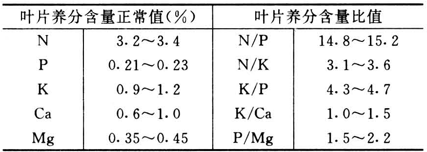 橡胶园合理的施肥方案,应依据叶营养诊断。健康生长和正常产胶的橡胶树叶片养分含量标准见表2。某种养分含量低于正常值时,应予施肥,施肥有效;高于正常值则不施;几种营养元素之间б值不平衡时,应通过施肥调节。