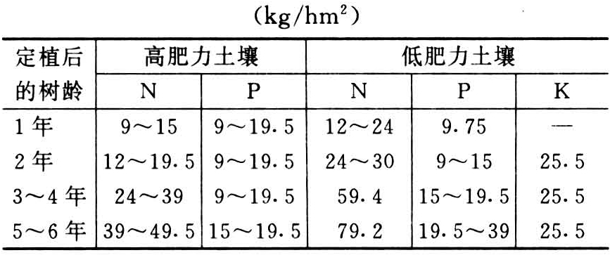 橡胶幼树和成龄割胶树施肥各有特点。①幼树施肥。不同树龄和不同肥力水平的土壤条件,施肥量应有所不同(表3)。幼树在大约4~6年期间,施肥量由少到多。胶苗定植时应将磷肥一次施入,在第一蓬叶稳定前,因根系少,不能施肥,定植当年的幼树根系尚不发达,施肥量宜少量多次,以后每抽一蓬叶时施一次肥,从开始分枝到树冠茂密阶段,需肥量增加,应在冬季和春季施入有机肥和磷、钾肥,生长期中分2~3次施用氮肥。树冠茂密到开始采胶阶段,应在冬季沟施有机肥和磷肥,以后在3月至4月、5月至7月、8月至9月分次施氮肥。第一次氮肥应占全年的一半,9月至10月施用钾肥。为了发挥肥料效果,应将肥料施于根尖部位,一般1~2年生树,施在距树干20~40厘米处;3~4年生树,施在距树干50~60厘米处;5~6年生树,施在距树干1~1.5米处,采用沟施或松土撒施的方法。②割胶树施肥。按几个时期施用。冬肥,在停止割胶后结合土壤管理挖沟施基肥,以有机肥和磷肥为主;早春抽叶前半月左右,追施第一次氮肥,用量应占全年用量的一半;6月至7月施第二次氮肥和钾肥,以满足第二个需肥高峰期的需求;秋后肥,9月至10月施用氮、钾肥,以满足胶树延续生长和产胶的需求,增强橡胶树的耐寒力和恢复树势。中国华南地区大部分土壤的有效钼含量低于全国平均水平,因此施用钼肥有明显地增产效果。
