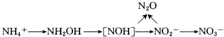 硝化作用分两个过程进行。首先是由亚硝酸细菌将铵氧化成亚硝酸盐,然后再由硝酸细菌将亚硝酸盐氧化成硝酸盐。在前一过程中,可能生成中间产物NH2OH和[NOH],并有微量的N2O逸出。在一般的土壤中,由于亚硝酸盐的氧化速率远比铵的氧化速率大,亚硝酸盐的含量极微,硝化作用的主要产物是硝酸盐。但是,在碱性环境中,由于硝酸细菌的活性受到抑制,亚硝酸盐可以有所积累。