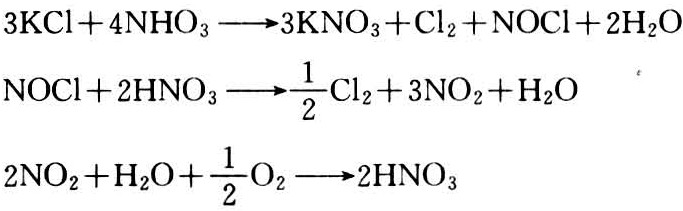 氯化钾在65%浓度的硝酸中于75℃下反应,生成硝酸钾、氯气和亚硝酰氯。后者用硝酸氧化后逸出氯气和二氧化氮。二氧化氮用空气氧化并用水吸收而重得硝酸。即: